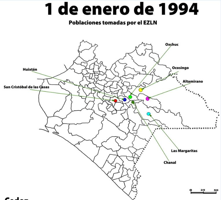 La víspera del cierre del Tratado de Libre Comercio entre América (TLCAN), Canadá y México, el EZLN lanza una ofensiva militar por sorpresa para tomar las localidades de Altamirano, Ocosingo, Oxchuc, Las Margaritas, Chanal, Huixtán, llegando hasta la cabecera provincial, la ciudad de San Cristóbal de las Casas.