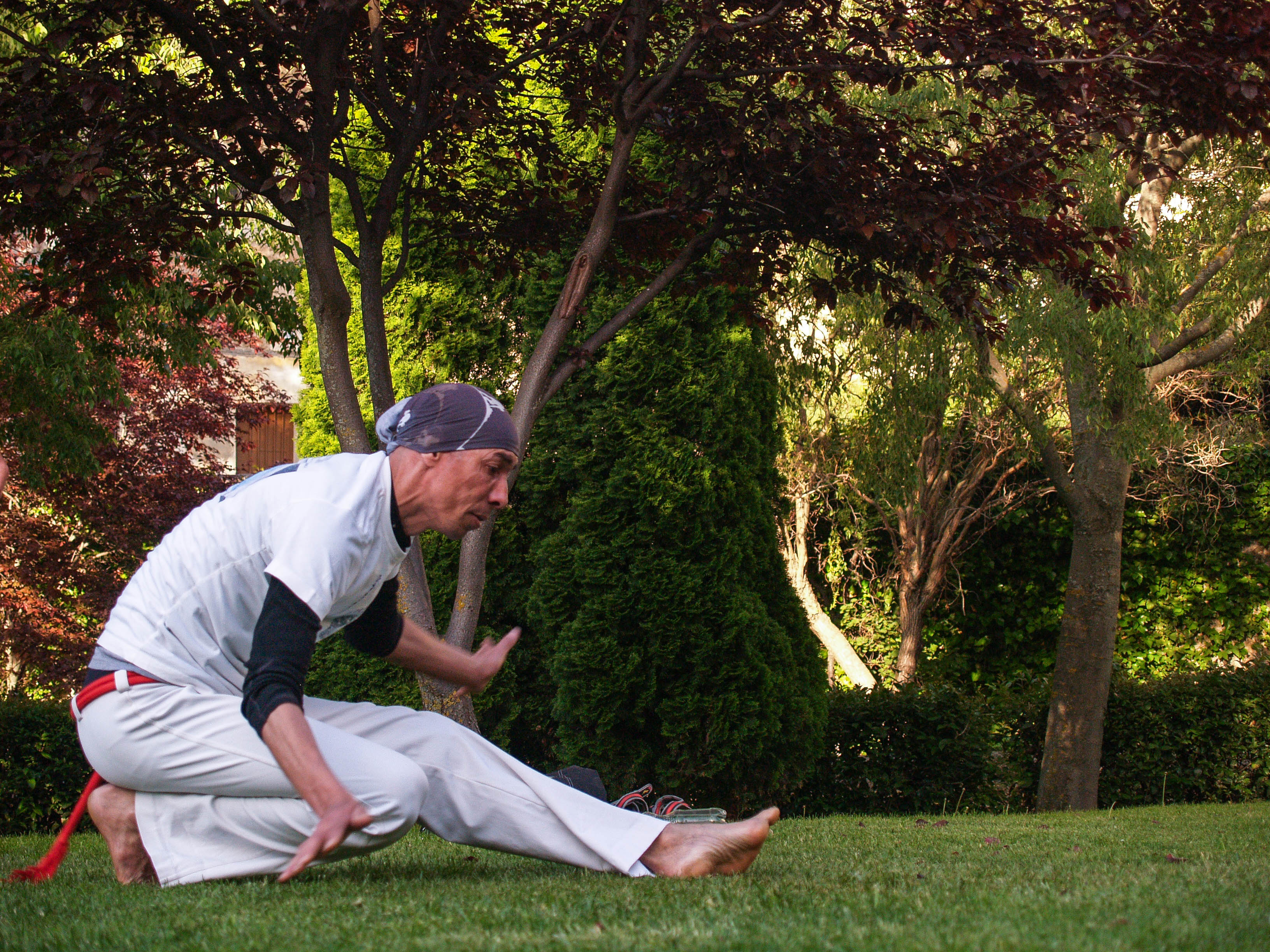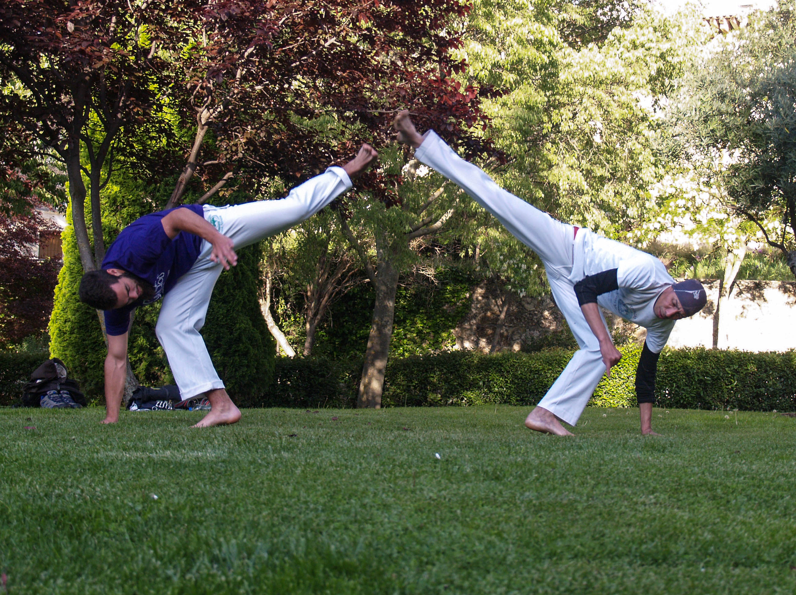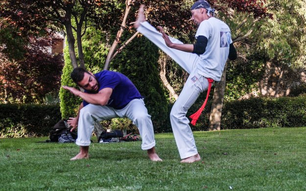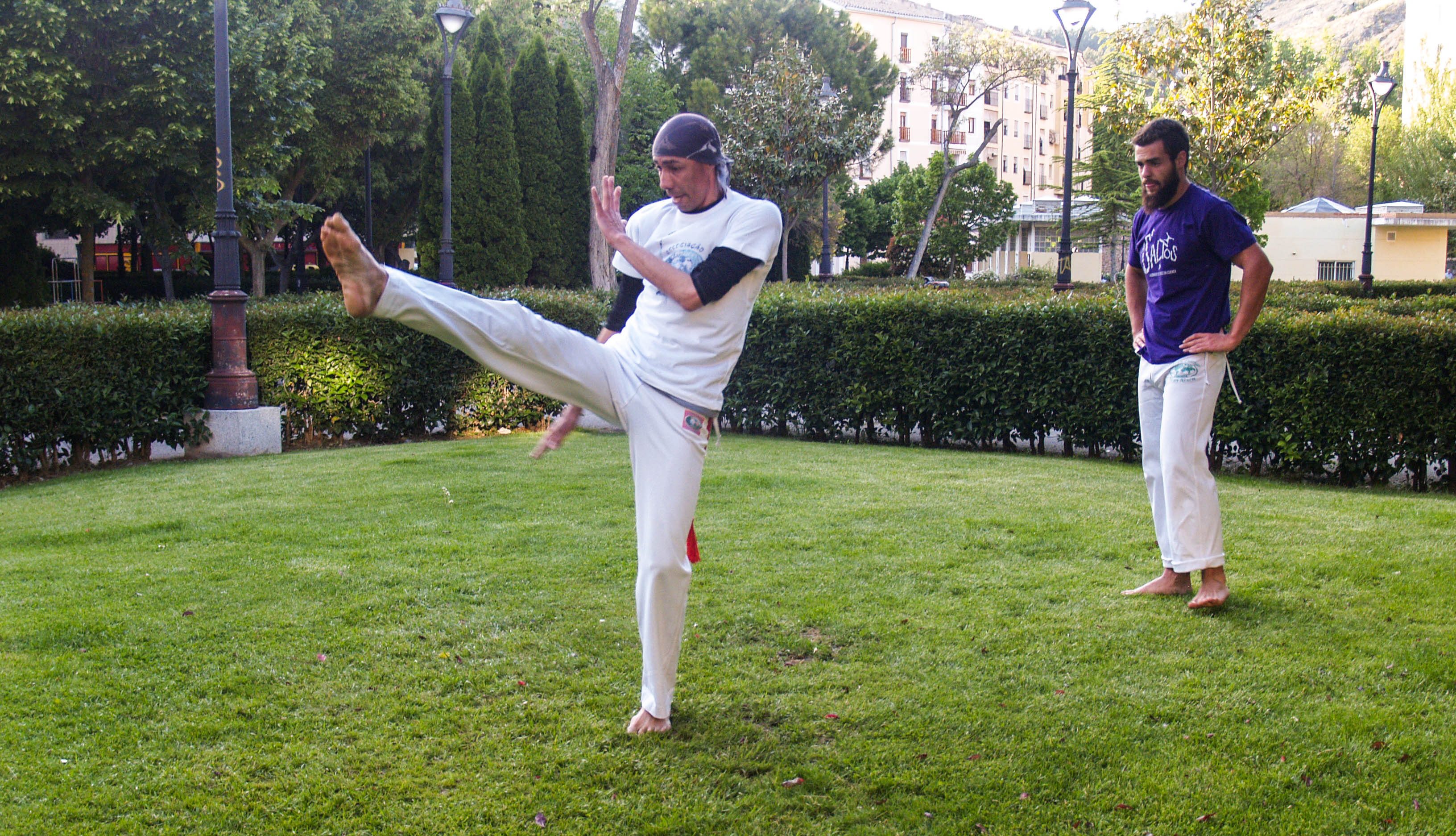 Estirar es importante. Los muchachos bromean sobre la flexibilidad del Mestre y él asegura que tiene 25 años. Antes, dice, era todavía más flexible. Difícil de creer, viendo cómo consigue doblarse sobre sí mismo. Ambos, descalzos sobre la yerba, están preparados para comenzar la sesión. Héctor dice que una sesión normal dura una o dos horas. Sin embargo ha llegado a dilatarse hasta cuatro. Comienzan con la “ginga” o “balanceo”. Se trata de acompasar el movimiento con el del contrario, en una suerte de espejo. Aprovecho para intentar conocer algo más de la historia de este baile-pelea. “La Capoeira original viene de África. Hace unos 70 o 60 años, había un maestro en Salvador de Bahía que se llamaba, “Mestre Bimba”. Su nombre real era Manoel dos Reis Machado. Fue el que creó los movimientos de la Capoeira actual, Capoeira Regiona . Cambió los movimientos en el suelo por otros más altos, incluyendo movimientos de otras artes marciales y movimientos relacionados con los animales, como la patada de un burro o los gestos de un “macaco”, el vuelo de un murciélago. En Brasil se pensaba que era una actividad de gente “mal hablada” de vagos, de gamberros que se juntaban en las calles porque no tenían trabajo ni nada que hacer. Entonces la policía perseguía a los capoeiristas, no les dejaban bailar en las plazas públicas porque pensaban que estaban haciendo vandalismo en la calle. Te llevaban preso 16 meses o un año. Luego esto cambió y se reconoció como arte. Ahora está extendida por todo el mundo” cuenta el Mestre.