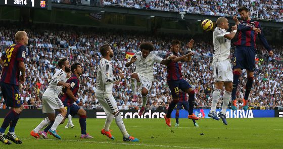 Minuto 18, gol del Barça. Falta lanzada por Neymar transformada a tiro de Mathieu. El público del Nou Camp se pone en pie y jalea al jugador que corre celebrando el tanto. Saque y Mathieu lo sigue intentando ante las caras de sorpresa del combinado merengue. Pepe, ya con una tarjeta encima, recibe un empujón de Luis Suárez que el jugador madridista exagera en un arranque interpretativo.