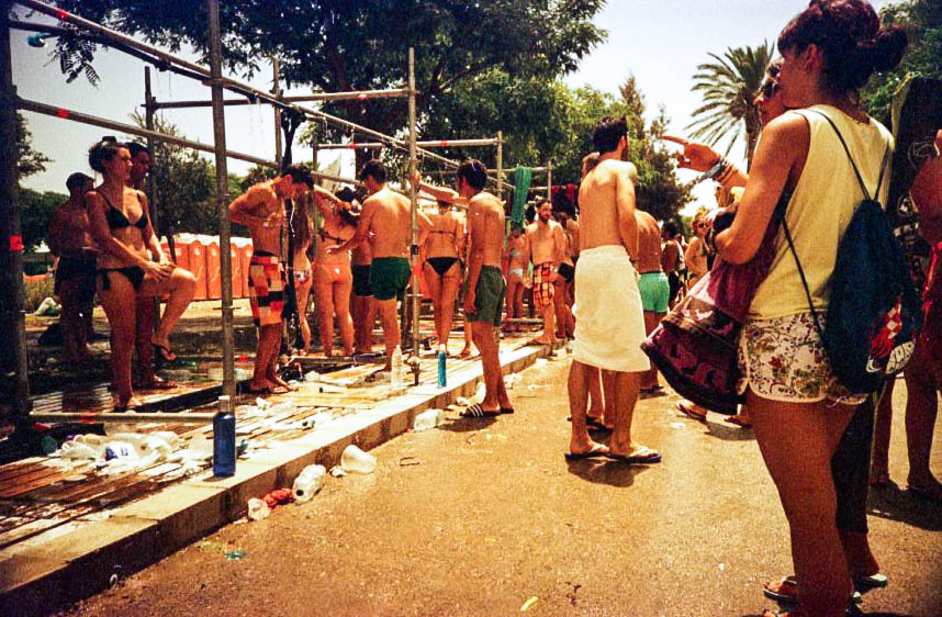 Tres tipos durmiendo juntos en una tienda de campaña a las diez de la mañana. Una temperatura de más de treinta grados, exagerados por la sensación de estar metido en un espacio de plástico cerrado. ¿Qué les hubiera costado poner todo el recinto a la sombra? Aquí entra en juego la teoría que comenta Hezra Ponz: la organización está desplegando una estrategia de guerra psicológica, control de masas para asegurarse un público dócil. Las continuas caminatas de kilómetros, la escasez de agua en las duchas comunitarias… llegando incluso al cierre absoluto del caudal… El agotamiento, la falta de sueño, la mala nutrición… nos vuelven influenciables y ariscos.